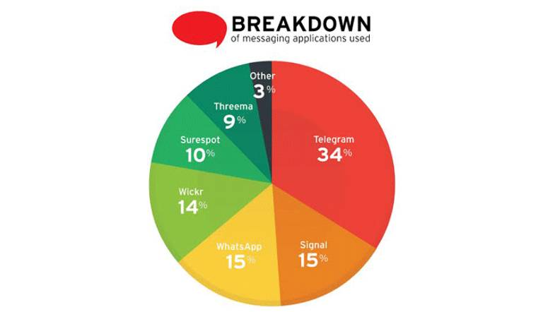 وإلى جانب "تيليغرام"، يشيع استخدام تطبيقات مجانية أخرى مثل "واتس آب"، الذي يستخدمه 15 في المائة من الإرهابيين، و"Wickr"، الذي تستخدمه النسبة ذاتها.