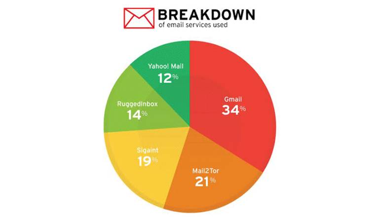 وإلى جانب تطبيقات الرسائل النصية، يشير التقرير إلى استخدام عناصر التنظيمات الإرهابية لخدمة البريد الإلكتروني للتواصل بينهم، حيث أوضح التقرير أن 34% من الإرهابيين يستخدمون تطبيق "Gmail" لتبادل الرسائل الإلكترونية، و21% يفضلون استخدام "mail2tor"  و12% يستخدمون "yahoo mail".