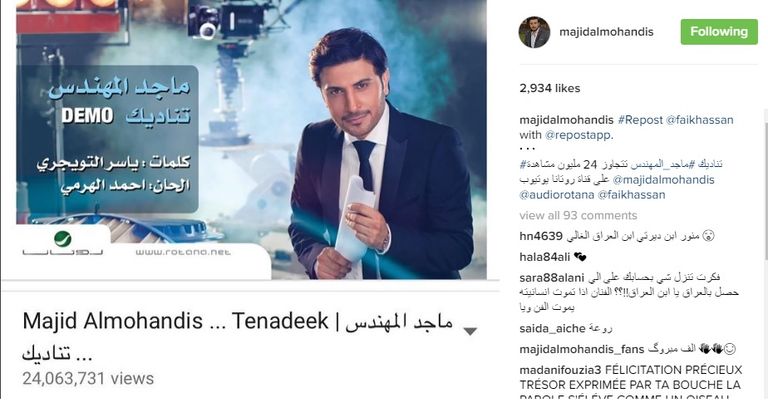 وقال المهندس: "تناديك ماجد المهندس تتجاوز 24 مليون مشاهدة على قناة روتانا يوتيوب".