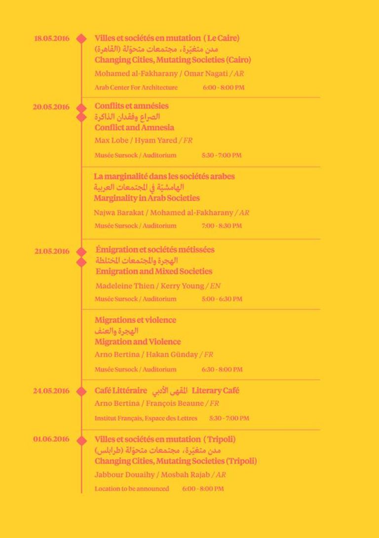 ويعقد في المعهد الفرنسي، لقاء "المقهى الأدبي" في ٢٤ مايو، مع فرانسوا بون من فرنسا وآرنو برتينا من فرنسا، ويقدم باللغة الفرنسية. كما يقام لقاء في طرابلس شمال لبنان تحت عنوان "مدن متغيرة.. مجتمعات متحولة" يشارك في جبور دويهي ومصباح رجب ويقدم باللغة العربية.