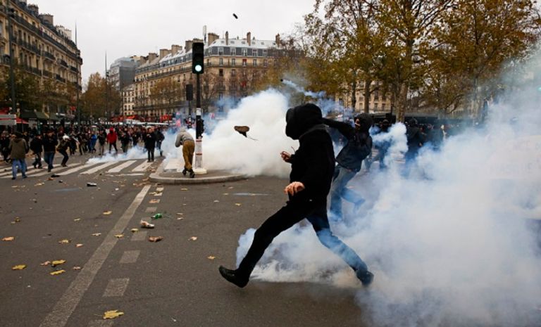 ولكن بعد ساعات أطلقت شرطة مكافحة الشغب الغاز المسيل للدموع على المحتجين الذين رشقوها بالزجاجات والشموع في ساحة الجمهورية، وهتفوا: "حالة طوارئ، دولة بوليسية" في إشارة إلى القيود التي فرضتها السلطات عقب اعتداءات باريس، واعتقل نحو 100 شخص عقب الاشتباكات، بحسب الشرطة.
