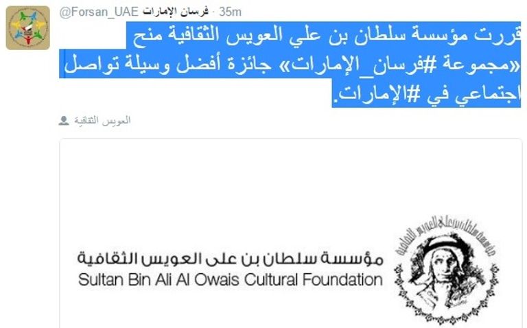 مؤسسة سلطان بن علي العويس الثقافية قررت منح مجموعة "فرسان الإمارات" جائزة أفضل وسيلة تواصل اجتماعي في الإمارات