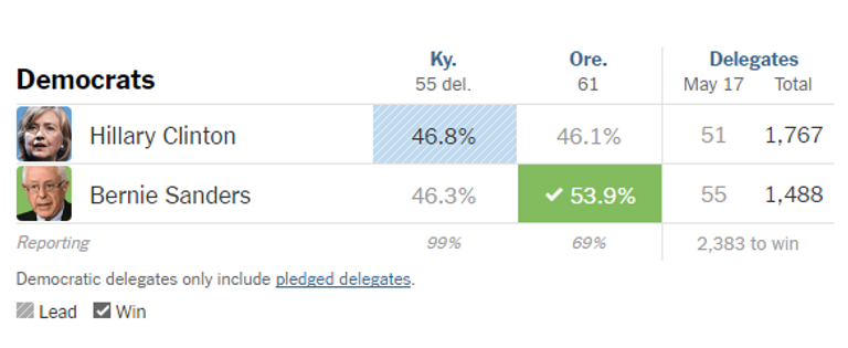 رغم فوز بيرني ساندرز بأصوات ولاية أوريجون، ألا أن فوز هيلاري بولاية كنتاكي جعلها أقرب للفوز بالترشح