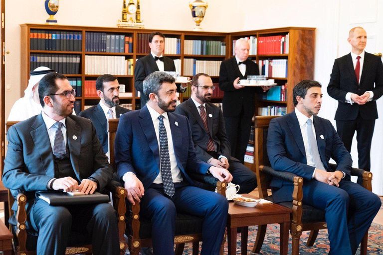 حضر اللقاء من الجانب الإماراتي الشيخ منصور بن زايد آل نهيان نائب رئيس مجلس الوزراء وزير شؤون الرئاسة والشيخ عبدالله بن زايد آل نهيان وزير الخارجية والتعاون الدولي، والدكتور سلطان بن أحمد الجابر وزير دولة المبعوث الخاص لجمهورية ألمانيا الاتحادية وعلي بن حماد الشامسي نائب الأمين العام للمجلس الأعلى للأمن الوطني وفارس محمد المزروعي المستشار في وزارة شؤون الرئاسة وعلي عبدالله الأحمد سفير الدولة لدى جمهورية ألمانيا الاتحادية.