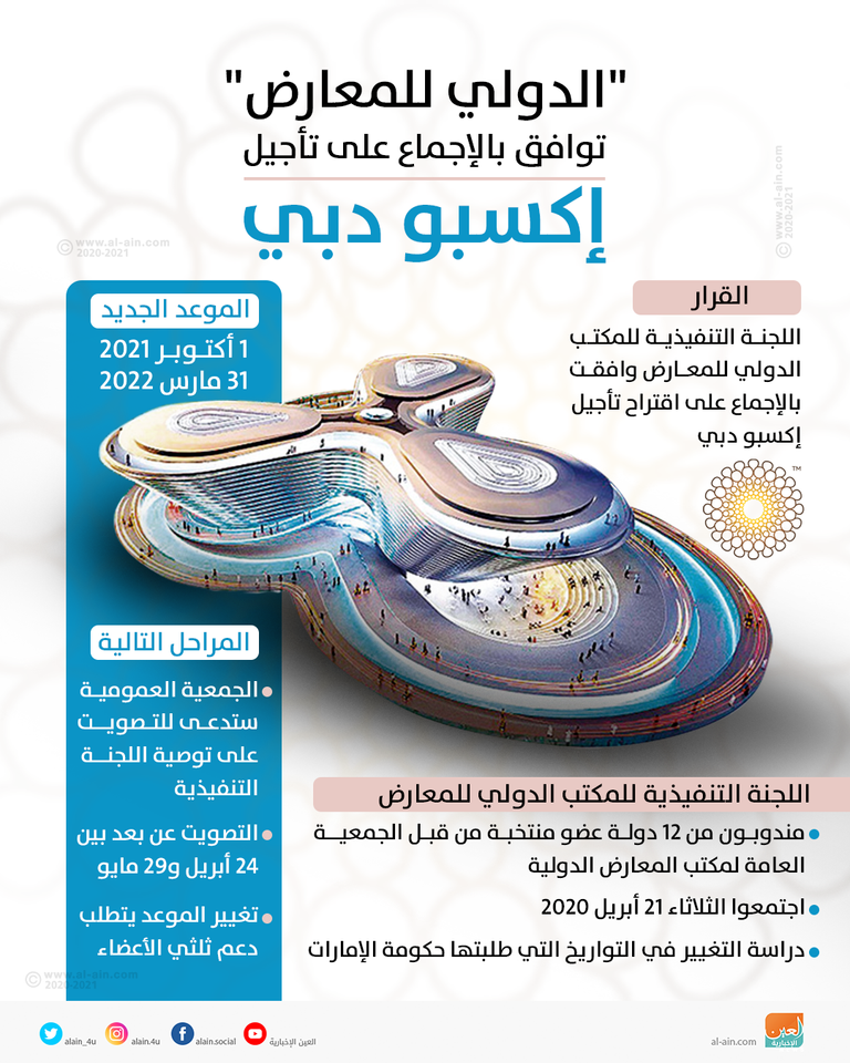وافقت اللجنة التنفيذية للمكتب الدولي للمعارض (BIE)، الثلاثاء، بالإجماع على اقتراح تأجيل إكسبو 2020 دبي إلى الفترة من 1 أكتوبر/تشرين الأول 2021 إلى 31 مارس/آذار 2022.
