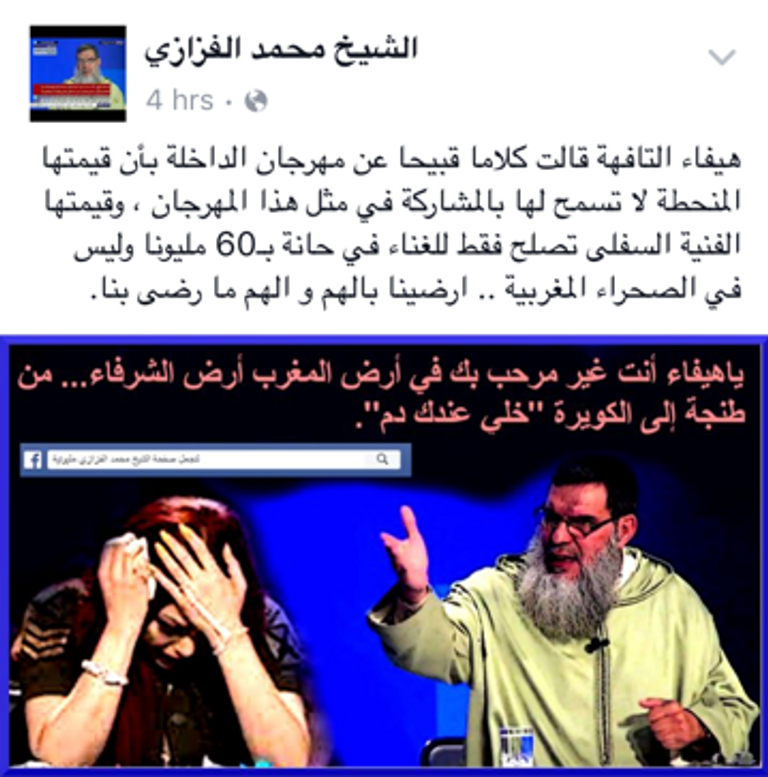 وشارك الشيخ المغربي محمد الفيزازي في الحملة الرافضة للزيارة، وعبَّر عن ذلك عبر حسابه الخاص على" فيس بوك" قائلًا بعد قائمة طويلة من السباب: "يا هيفاء؛ أنتِ غير مرحب بكِ في أرض المغرب -أرض الشرفاء- من طنجة إلى الكويرة (خلي عندك دم)".