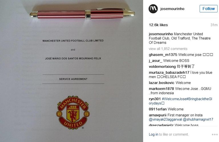 وبحسب شبكة "سكاي سبورتس" البريطانية، فإن مورينيو وضع أول صورة له عبر حسابه الشخصي على موقع "إنستجرام"، وهي عبارة عن صورة للغلاف الرئيسي لعقد الاتفاق بينه وبين مانشستر يونايتد.