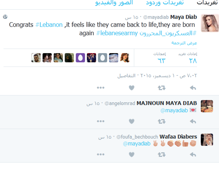 وحازت تغريدة مايا على إعجاب متابعيها عبر الموقع، والذين شاركوها الفرحة بعودة الجنود اللبنانيين.