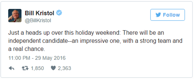 وقال كريستول في تغريدة له "مجرد تنويه خلال عطلة نهاية الأسبوع: سيكون هناك مرشح مستقل – مثير للإعجاب، من فريق قوي ولديه فرصة حقيقية في الفوز".
