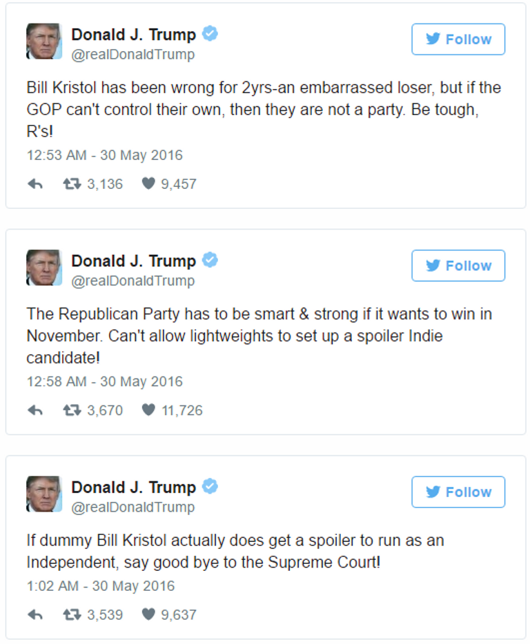 أطلق المرشح الجمهوري بانتخابات الرئاسة الأمريكية دونالد ترامب سيلا من التغريدات الغاضبة ضد بيل كريستول، مدير تحرير مجلة "ويكلي ستاندارد"، ردا على قيام الأخير بالإعلان عن مرشح مستقل "مثير للإعجاب" سيدخل السباق الرئاسي.