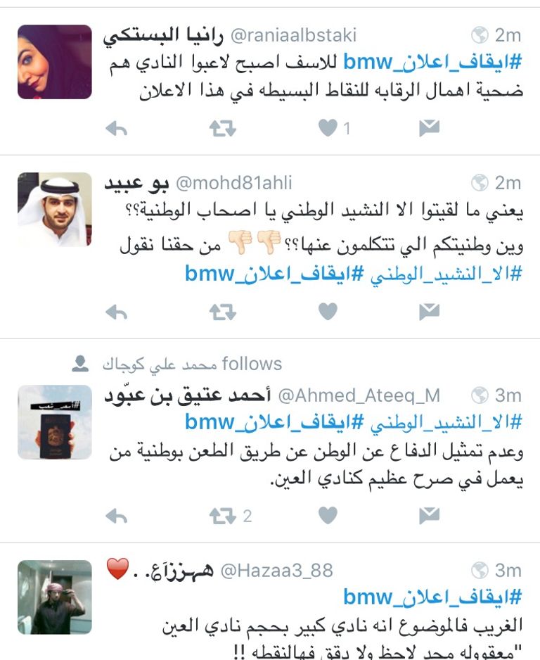 دعت جماهير نادي العين الإماراتي إلى وقف إعلان لشركة "بي إم دبليو"، يظهر فيه لاعبو فريق العين، اعتبرته مسيئا إلى النشيد الوطني الإماراتي.