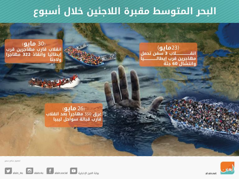 وكانت آخر الحوادث خلال هذا الأسبوع الدامي في 30 مايو، وانقلب خلالها قارب مهاجرين قرب إيطاليا، ولقي البعض حتفه، فيما تم إنقاذ 322 مهاجرًا ولاجئًا.