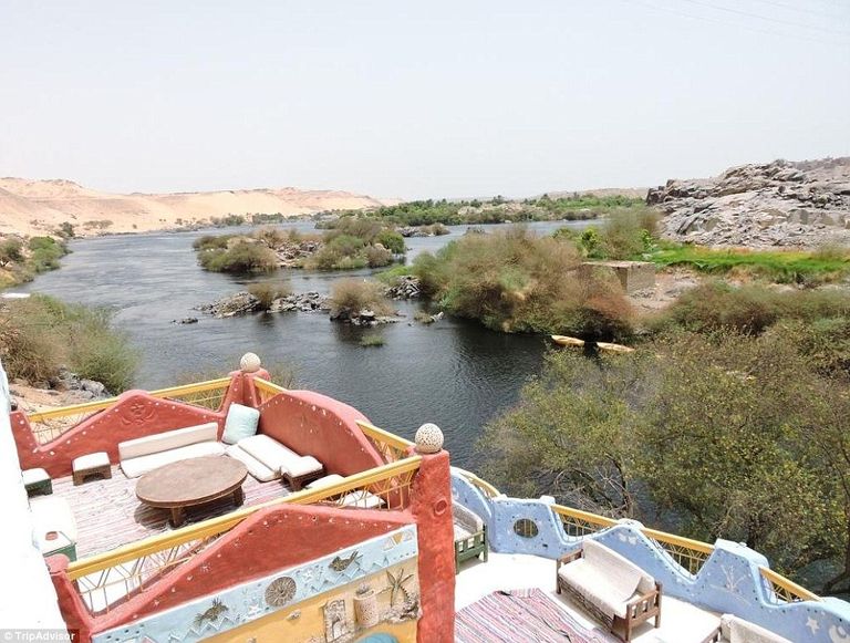 أما فيما يتعلق بأماكن الجلوس خارج الأبنية، فهي مساحات كبيرة يلفها الهواء الطلق من كل جانب، ويتخللها مشهد من المناظر الخلابة تطل على النهر المقابل لمدينة أسوان المصرية.