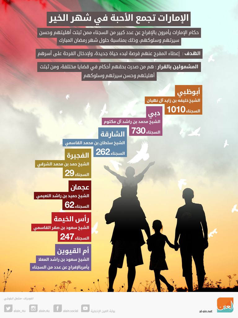 الإمارات تسعى لتعم البهجة مع قدوم شهر رمضان على عائلات المعفو عنهم، وما لهذا من أثر يحفز بقية المحكوم عليهم على الالتزام بحسن السلوك.