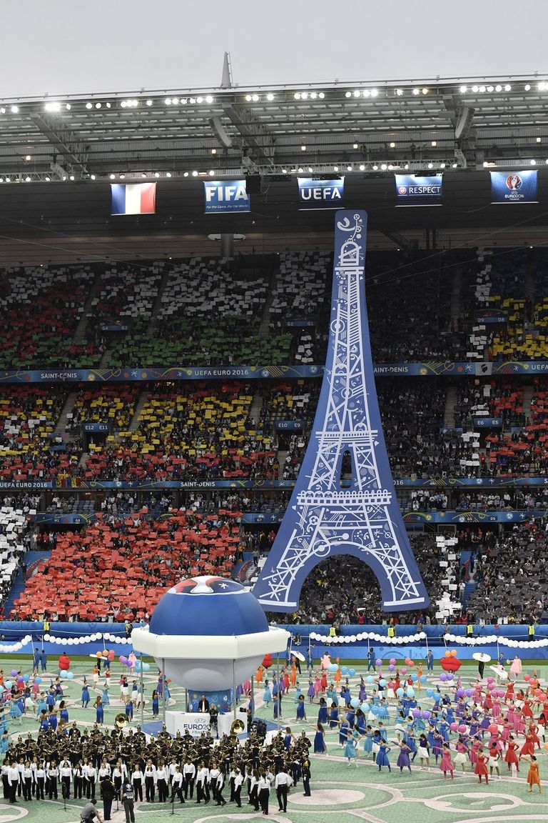 واستغرق حفل الافتتاح 15 دقيقة، وكان موضوعه "مرحبًا بكم في فرنسا"، وكان ضيف شرفه النجم المؤلف للأغنية الرسمية للبطولة، الفرنسي ديفيد غيتا، في جو احتفالي بعيد عن البيئة المتوترة بين الحركات الاجتماعية والمخاوف الأمنية.