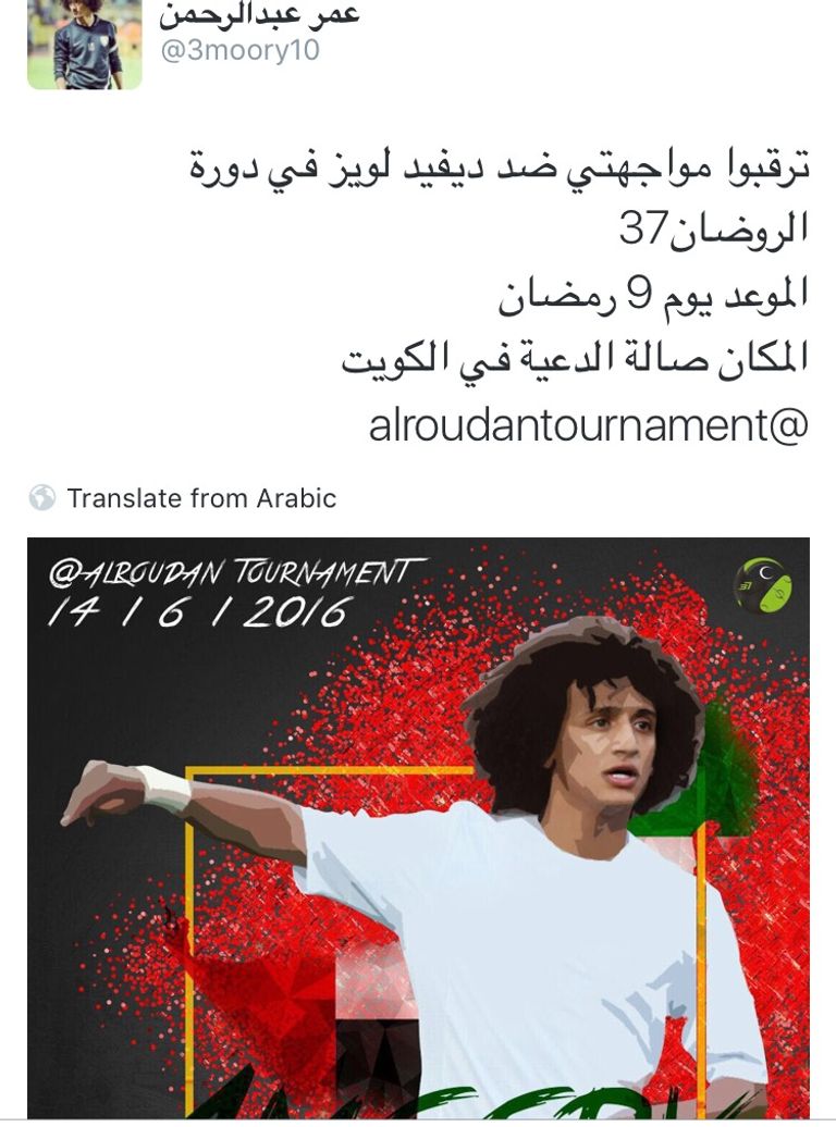 وقال عموري عبر حسابه الشخصي على موقع التواصل الإجتماعي "تويتر" : "ترقبوا مواجهتي مع ديفيد لويز في دورة الروضان في صالة الدعية بالكويت".