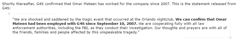وقالت الشركة في بيانها "نحن في G4S في حالة صدمة وحزن بسبب الحادث الأليم الذي طال رواد الملهى الليلي في أورلاندو، ونحن نؤكد أن عمر متين كان يعمل معنا لصالح الشركة منذ 10 سبتمبر/أيلول 2007".