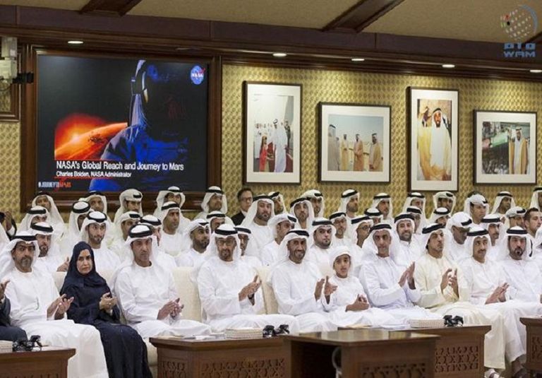 شهد الشيخ محمد بن زايد آل نهيان ولي عهد أبوظبي نائب القائد الأعلى للقوات المسلحة -في مجلسه الرمضاني اليوم- المحاضرة الأسبوعية الثانية التي دارت حول عالمية ناسا ورحلة الإنسان إلى المريخ.