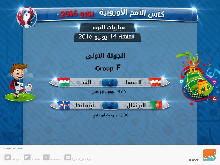 وفي وقت لاحق، تقام مباراة البرتغال وأيسلندا في منتصف الليل بتوقيت أبو ظبي.