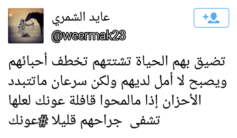 وتفاعل المغردون على موقع التدوينات الصغيرة "تويتر" مع حلقة "عونك"، وجاء التعليقات كالتالي "تضيق بهم الحياة، تشتتهم، تخطف أحباءهم، ويصبح لا أمل لديهم، ولكن سرعان ما تتبدد الأحزان إذا ما لمحوا قافلة عونك، لعلها تشفى جراحهم قليلًا، صعب على عقل مادي أن يفهم معادلة العطاء السعيد، من زرع حصد، وهذي غرسة زايد الخير رحمة الله عليه".