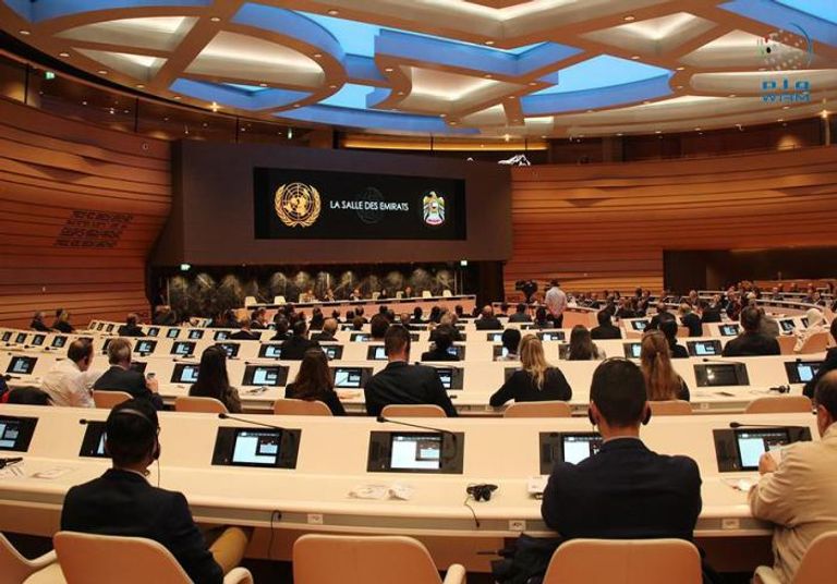 وأضافت أنه سعيا من دولة الإمارات لإنجاح هذا المشروع الذي سيمكّن المجموعة الدولية من ظروف عمل ملائمة فإن الدولة قامت بصيانة هذه القاعة تعبيرا عن أصالة الامارات وشعبها وعن خياراتها ورؤيتها الاستراتيجية الطموحة نحو الأمثل في جميع القطاعات ولذلك كان هناك حرص على أن تكون هذه القاعة تجسيدا لهذه الروح المبدعة والتواقة للمستقبل وعلى أن يقدم هذا العمل المتكامل نموذجا في التعامل بين مختلف الأطراف في انجاز مشروع عصري وعالي الجودة يراعي آليات عمل كل طرف ويحترم في ذات الوقت المعايير الدولية في ميدان الهندسة والمعمار وتسليمه في المواعيد المحددة في رؤية واضحة قائمة على الالتزام والحداثة ومواكبة للتطور في دقة وتوازن.