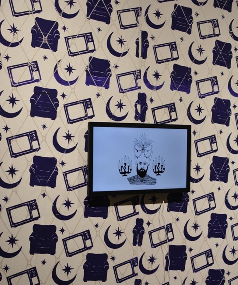 المزينة لفت لـ"العين" إلى أننا "دائما ما نتجمع حول التلفاز بعد الإفطار، ومن هذه العادة استوحيت عملي التركيبي، حيث يتشكل العمل من أريكة للجلوس وشاشة عرض تلفزيونية تعرض عليها صور أيكونية متتابعة لبرامج ارتبطت بهذا الشهر من الماضي أو الحاضر، كالفوازير الرمضانية لـ "نيلي" و"شريهان" وشخصيات "بوجي وطمطم" والمسلسلات الكويتية والسورية والتركية التي اعتاد الجمهور العربي والإسلامي مشاهدتها خلال هذا الشهر".