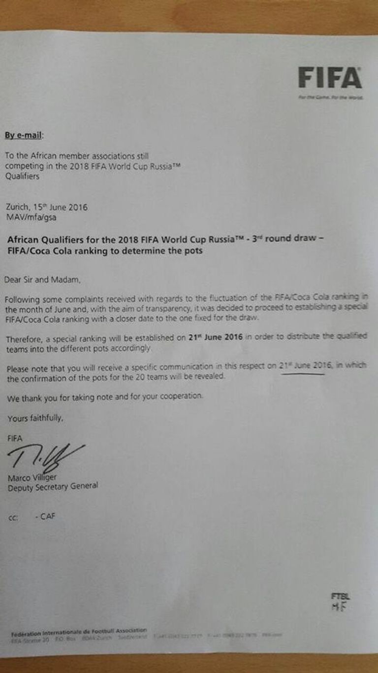 وبحسب الخطاب الذي نشره الموقف الأوغندي، فإن الفيفا استجاب لطلب الجانب المصري – الذي هدد بالتصعيد للمحكمة الرياضة الدولية – وعليه سيعيد إجراء التصنيف الاستثنائي لأفريقيا يوم 21 يونيه الجاري أي قبل 3 أيام من إجراء قرعة المرحلة الأخيرة من تصفيات كأس العالم "روسيا 2018".
