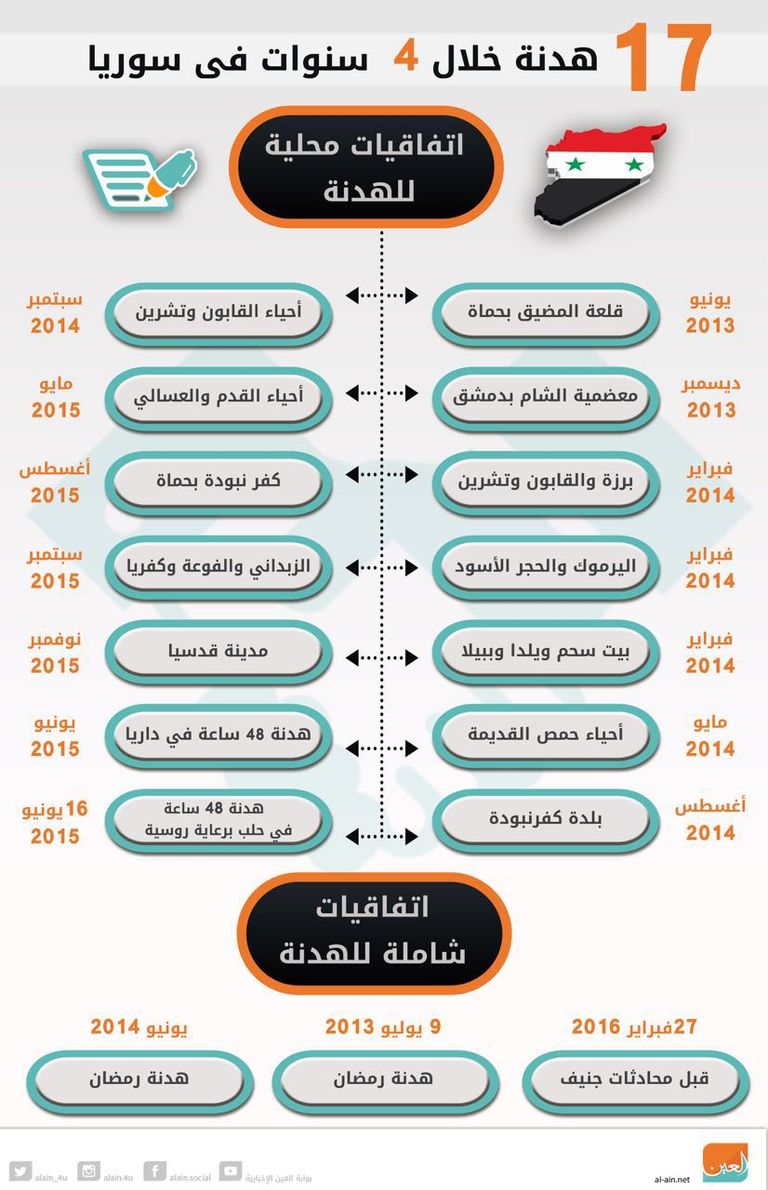 وفيما يلي إنفوجراف "العين" يوضح 17 هدنة في سوريا