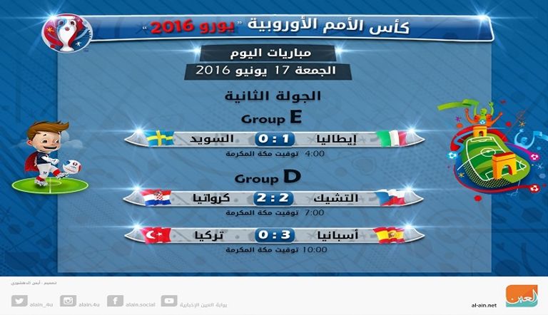 وأسفرت المباراة الأولى عن فوز المنتخب الإيطالي على نظيره السويد بهدف قاتل ليحجز مقعده في ثمن نهائي البطولة.