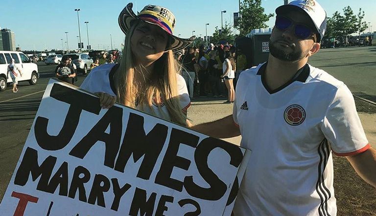 طلبت إحدى المشجعات الحاضرات لمباراة كولومبيا أمام بيرو، في ربع نهائي بطولة كوبا أمريكا، من جيمس رودريجيز قائد المنتخب الكولومبي قبول الزواج منها.