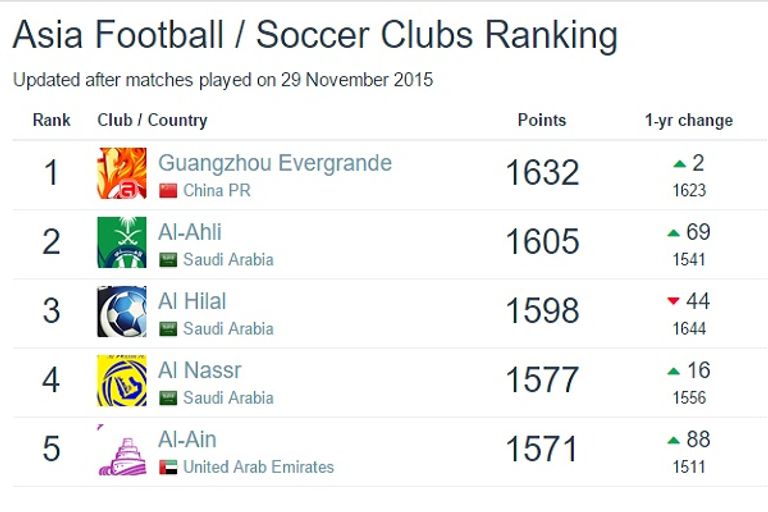 أما على صعيد الأندية الآسيوية، فقد احتل "العين" المركز الخامس خلف غوانغزو الصيني، بطل دوري أبطال آسيا (65 عالميًّا)، وأندية الأهلي والهلال والنصر السعودية.