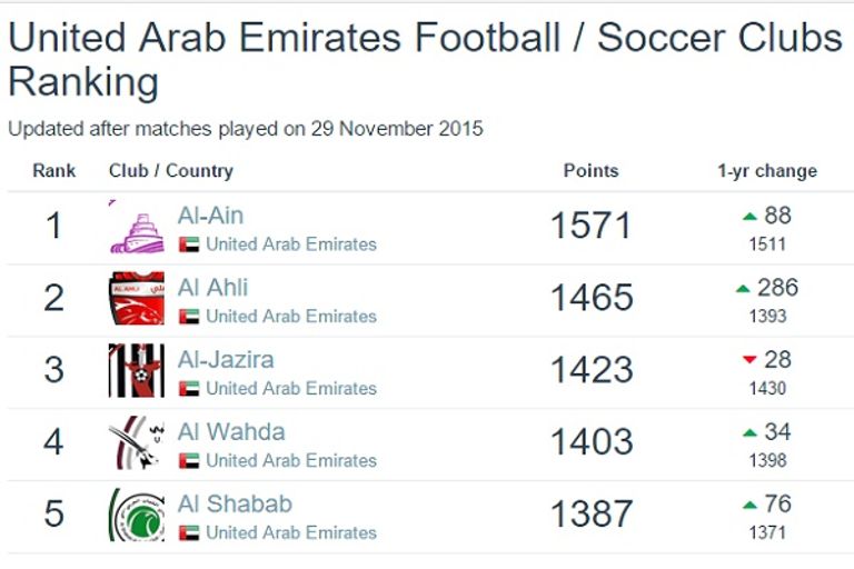واحتل نادي العين هذا المركز بعد أن حصل على 1571 نقطة، أهلته أيضًا ليكون في صدارة ترتيب الأندية الإماراتية، متفوقًا على النادي الأهلي، وصيف دوري أبطال آسيا الذي احتل المركز الـ361 برصيد 1465 نقطة.