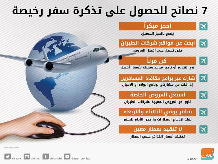 ترصد بوابة العين الإخبارية في الإنفوجراف التالي 7 نصائح تساعدك في الحصول على أرخص تذاكر الطيران.