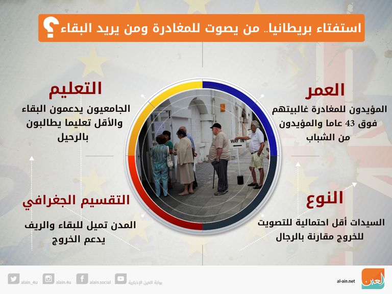 بوابة" العين " الإخبارية تشرح في إنفوجراف نِسب ونوع وتعليم المؤيدين لبقاء بريطانيا في الاتحاد الأوروبي ونسب المؤيدين للمغادرة.