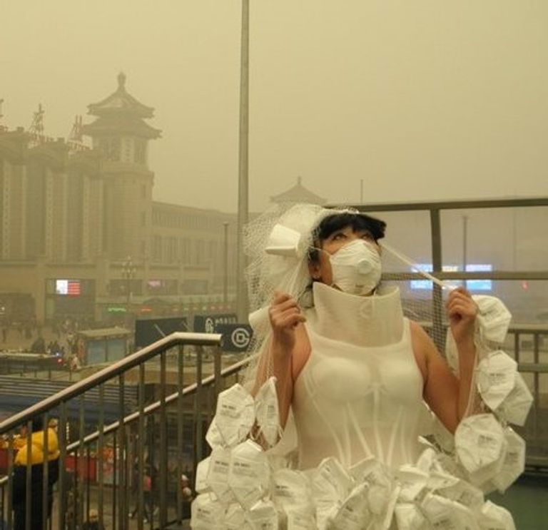 وارتدت الفنانة التشكيلية هونغ نينغ خلال العرض الذي أقامته في مدينة بكين بداية شهر ديسمبر الجاري فستان زفاف أبيض حاكته بـ999 قناعًا مضادًا للدخان.