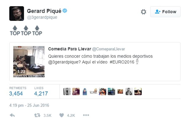 ونشر مدافع برشلونة -عبر حسابه بموقع التواصل الاجتماعي- فيديو ساخرًا تدور قصته حول مجموعة من الصحفيين الذين لا يجدون قصة إخبارية مثيرة لنشرها، ثم عثروا بالصدفة على لقطة بيكيه في المباراة، وعبروا عن فرحتهم بعدما وجدوا ضالتهم فيما فعله المدافع الإسباني.