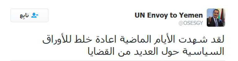 الحساب الرسمي للمبعوث الدولي للأزمة اليمنية إسماعيل ولد الشيخ على تويتر، ربما يقدم إجابة على هذا السؤال، فما يلبث أن يعلن من خلاله عن حدوث تقدم في مشاورات السلام، وأنهم باتوا أقرب إلى الاتفاق من أي وقت مضى، حتى يفاجئه الحوثيون بما يجعله يتراجع عن نغمة التفاؤل.