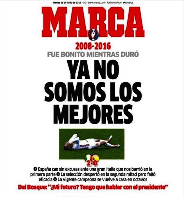 وقالت صحيفة "ماركا" في صفحتها الرئيسية "لم نعد الأفضل. 2008-2016 كانت فترة رائعة أثناء استمرارها.. بدأت وانتهت بإيطاليا."