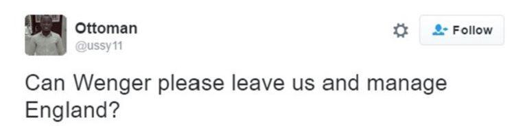 وغرد مستخدم يدعى "أوتومان": "هل بالإمكان أن يتكرم فينجر ويتركنا ويذهب لتدريب إنجلترا؟".