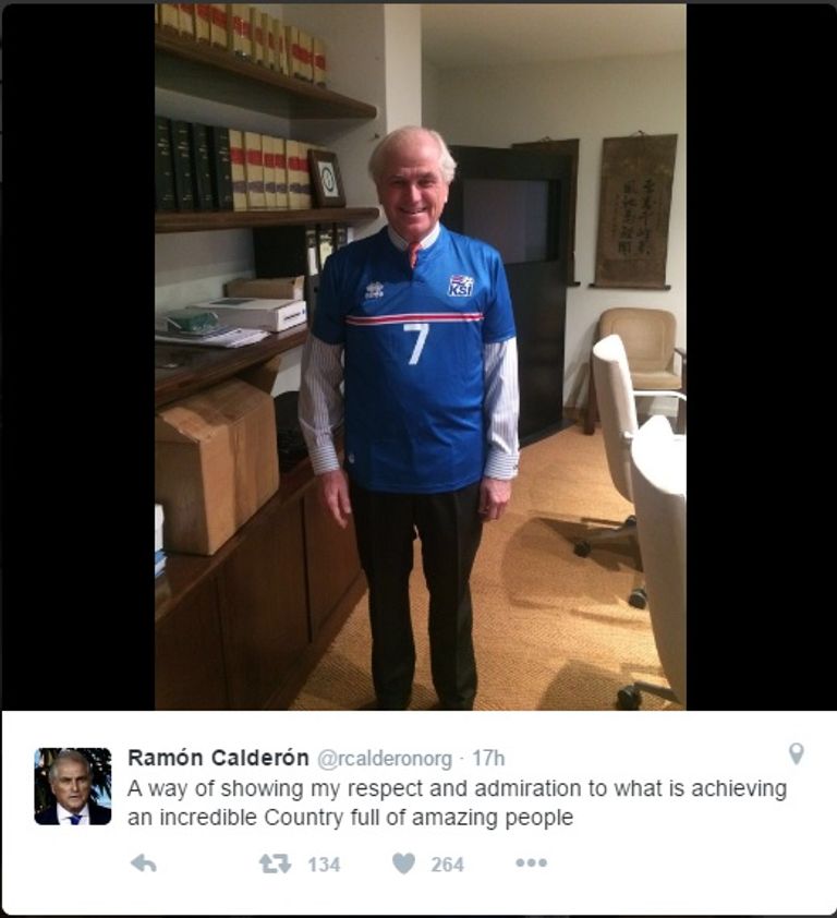 ونشر كالديرون صورة عبر حسابه الشخصي بموقع التواصل الاجتماعي "تويتر" وهو يرتدي قميص المنتخب الآيسلندي مع تعليق: "طريقة لإظهار احترامي وإعجابي بما حققته دولة رائعة مليئة بالناس المذهلين".