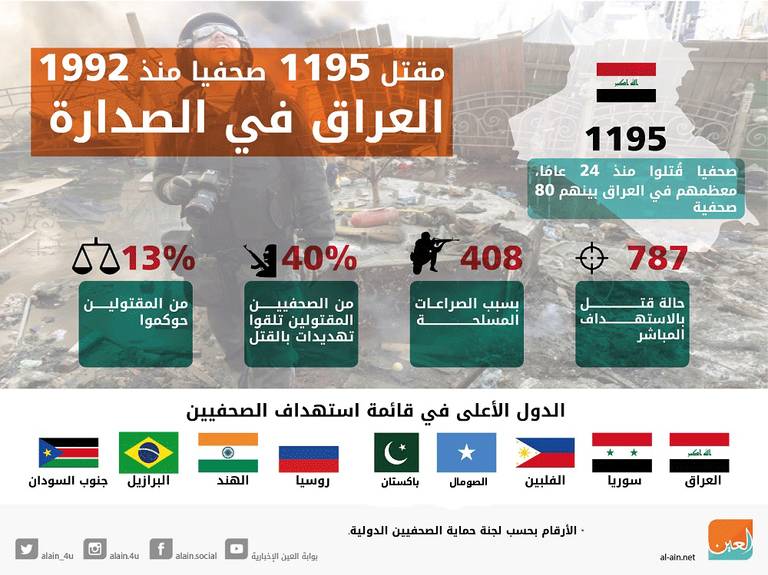 إنفوجراف.. مقتل 1195 صحفيا منذ عام 1992 معظمهم في العراق