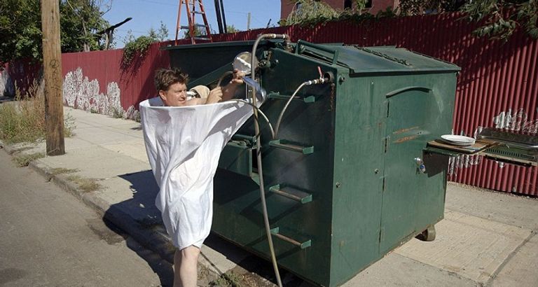 مصمم من كاليفورنيا حوّل مكبًا للنفايات يقدر بـ2000 دولار إلى منزل كامل متنقل، يحتوي على حمام وسرير ومطبخ ومكان للاستجمام بأشعة الشمس، ووضع فوقه خزانًا للماء يتسع لـ6 غالونات ليغطي احتياجاته من شرب واستحمام وغيره.