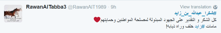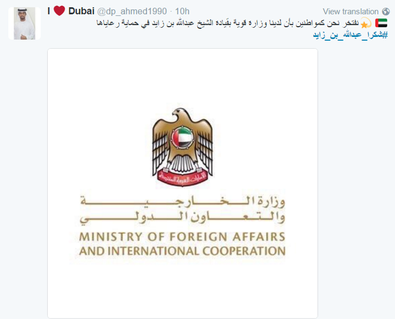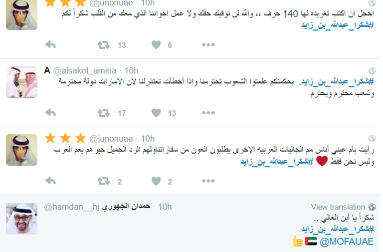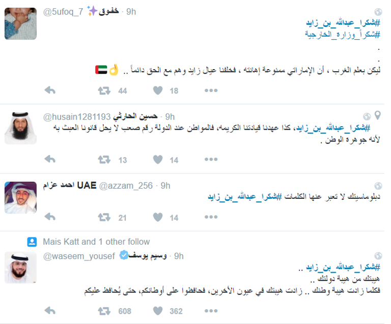 ولم يغب شكر المغردين لوزارة الخارجية الإماراتية ككل بالتالي التي تقوم بدورها على أكمل وجه في الوقت المناسب، وذلك في هاشتاقات أخرى مثل "#شكراً_وزارة_الخارجية"، وتلك التي تدل على وحدة البيت الإماراتي مثل "#البيت_متوحد_بقيادة_خليفة"..