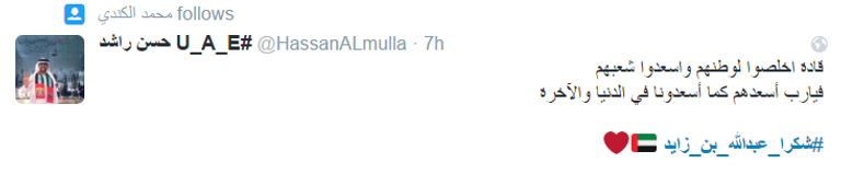 كما ربط المغردون بين سياسة الشيخ عبد الله بن زايد وحكمة المغفور له الشيخ زايد بن سلطان آل نهيان، الذي ترك بصمته الدبلوماسية واضحةً في حكام وشيوخ بلده، وهم لا ينامون حتى يستعيدوا كرامة أي مواطن.