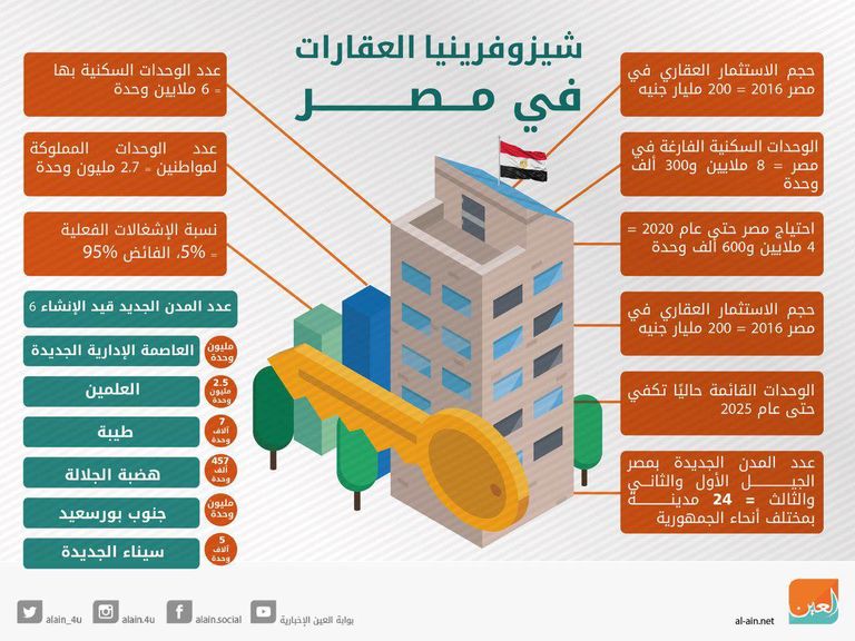 بوابة "العين" الإخبارية حصلت على أرقام هامة بشأن العقارات في مصر تؤكد أن قطاع العقارات في مصر يعاني "شيزوفرينيا"، البيانات المنسوبة إلى الجهاز المركزي للتعبئة والإحصاء ووزارة الإسكان المصرية، تفيد بأن عدد الوحدات السكنية الفارغة في مصر 8 مليون و300 ألف وحدة، وأن احتياج المصريين من الوحدات السكنية حتى عام 2020 سيبلغ 4 مليون و600 ألف وحدة على الأكثر، مما يعني وجود خلل في معادلة العرض والطلب، وبحسب الدراسة التي أعدها الدكتور أبو زيد راجح وكيل وزارة الإسكان ورئيس المركز القومي لبحوث الاسكان السابق، فإن مصر لديها وحدات سكنية قائمة تكفي حتى عام 2025 دون إنشاء أي وحدات سكنية جديدة.