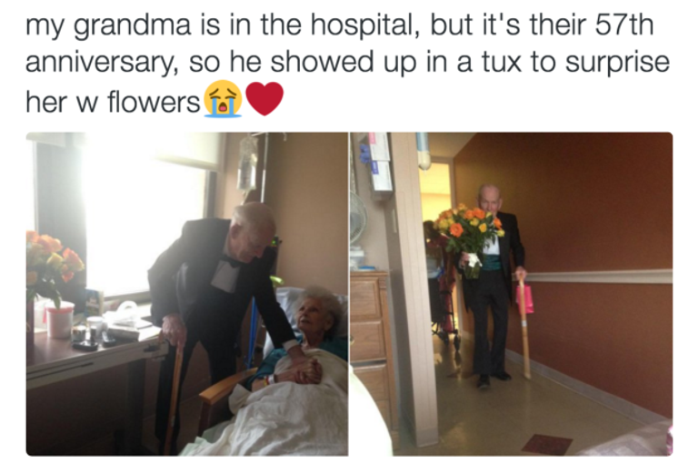 2- الذهاب إلى المشفى أمر مؤلم.. لكن يهون الألم مع زوج يفاجئ زوجته في الذكرى 57 لزفافهما بزيارتها مرتديًا بدلة التكسيدو وحاملًا الزهور.