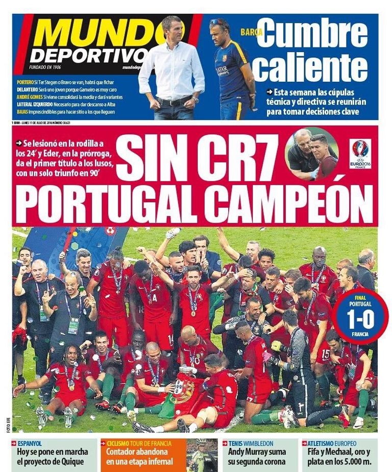 ركزت الصحف الكتالونية المقربة من نادي برشلونة على غياب كريستيانو رونالدو، قائد المنتخب البرتغالي ونجم ريال مدريد الغريم، عن منتخب بلاده في مباراة النهائي لبطولة يورو 2016 أمام المنتخب الفرنسي صاحب الأرض والجمهور، وذلك بعد خروجه في الدقيقة 25 متأثرًا بإصابته، وقدرة فريقه على التتويج باللقب من دونه.
