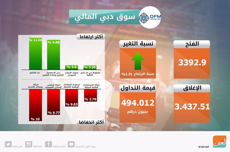 أنهى مؤشر سوق دبي المالي التداولات في المنطقة الخضراء رابحا 44.61 نقطة بنسبة 1.31% ليغلق عند مستوى 3437.51 نقطة، وصعد بأعلى وتيرة له في 21 جلسة، بعد التداول على 272.518 مليون ورقة مالية بقيمة إجمالية 392.420 مليون درهم إماراتي.