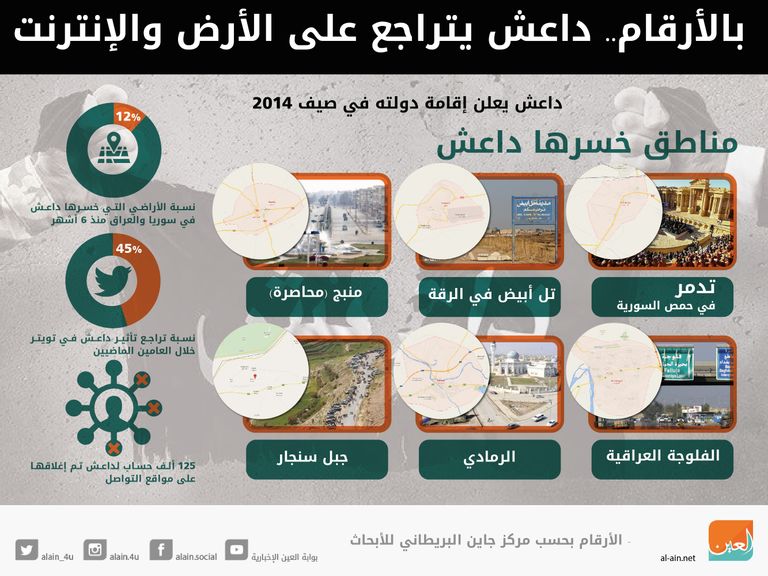 بوابة العين الإخبارية ترصد بالأرقام تراجع تأثير داعش على الأرض والإنترنت والمناطق التي خسرها.