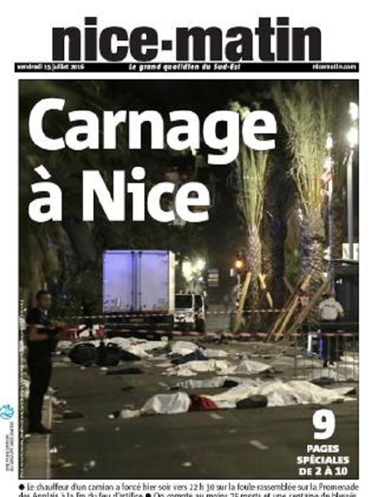 بينما وصفت صحيفة "نيس ماتين" في صفحتها الأولى الهجوم بأنه "مذبحة في نيس" وأفردت 9 صفحات لتغطيته.